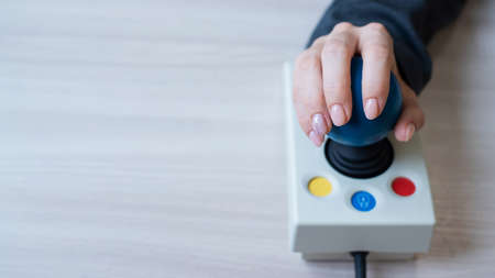 Person holds retro joystick in her hand. Gaming joystick from the mid-1980s. Joystick has dust particles and scratches.