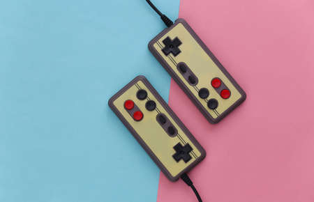 Two retro gamepads on a blue-pink background. Pastel color trend. Gaming, video games. Top view, minimalism