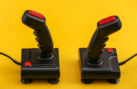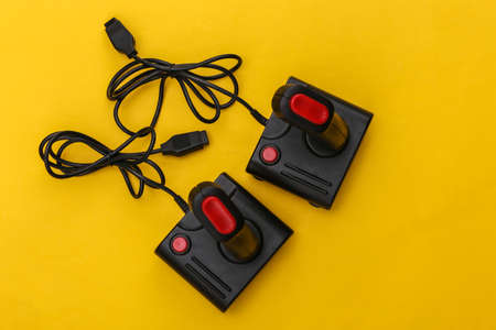 Video game Gamepads. Gaming concept. Top view two retro joysticks on yellow background.