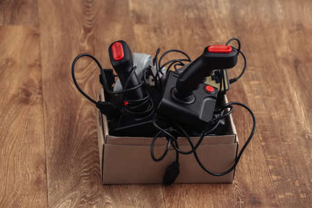 Cardboard Box with old wired joysticks and gamepads on a wooden floor