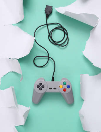 Retro gamepad on blue background with white torn paper. concept art. minimalism. top view