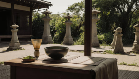 A tranquil scene in a Japanese garden featuring a tea ceremony setup with a bowl and cup, surrounded by traditional stone lanterns and lush foliage.
