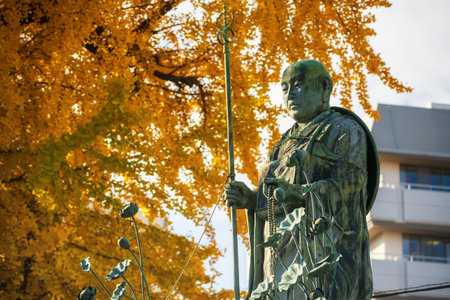 Kobo Daishi Buddhist monk statue against Ginkgo yellow leaf at autumn in Shitennoji Temple Osaka, Japan. Famous travel destination for sightseeing Kansai in fall season.