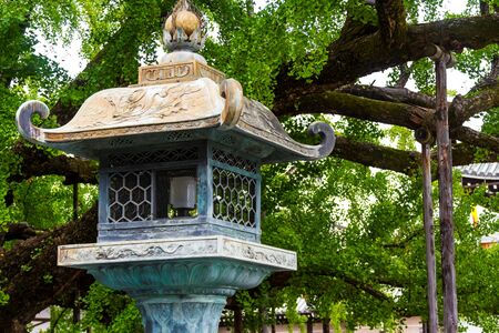 Old lantern with cherry blossoms at Osaka Tenmangu Shrine in Osaka, Japan