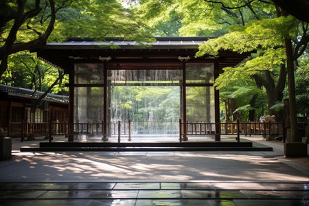 An interior space features large windows framing a vibrant forest scene. The sunlight filters through the trees, casting shadows on the wooden floor. The composition includes architectural elements of a traditional structure, creating a sense of peace and harmony. This image is suitable for various commercial uses, including promoting travel and wellness.