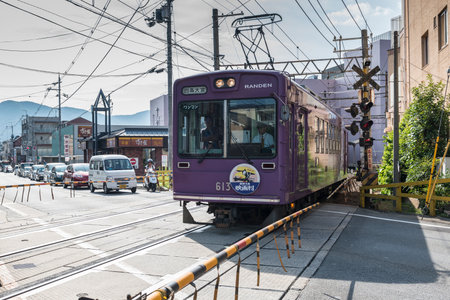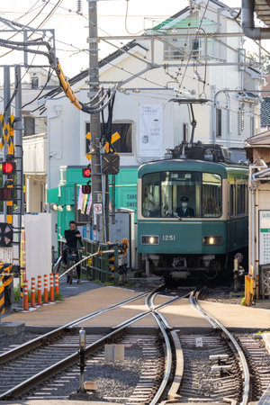 Kamakura, Japan- 14 May, 2024: Enoshima Dentetsu train Line in Kamakura, Japan. It casts its retro charm throughout the seaside town of Kamakura