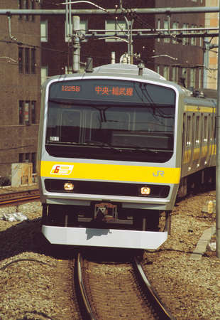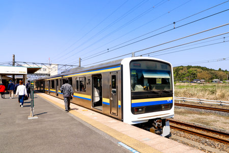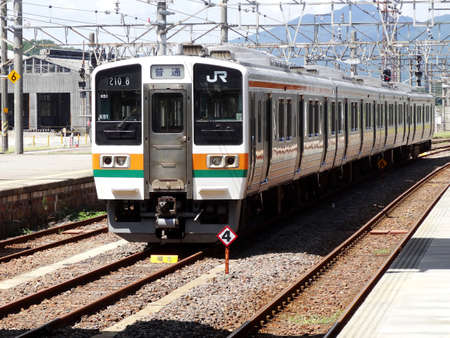 Ashikaga, Japan - May 20, 2017. Close-up of a train at railway station in Ashikaga, Japan. Railways are the most important means of passenger transportation in Japan.