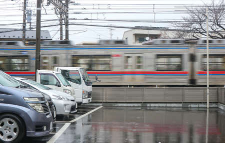 2020 March 02. Tokyo Japan. Japanese cars row with blurred running Keisei line train on rainning day.