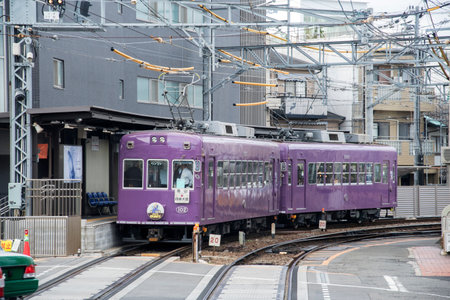 Kyoto, Japan- 26 Nov, 2019: Retro-style tram of Randen Kitano Line appoaching Tenjingawa Station in Kyoto. Operates by private Keifuku Electric Railroad
