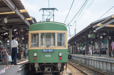 Kamakura, Japan- 14 May, 2024: Enoshima Electric Railway train approachs the station in Japan. Enoden is the sixth oldest railway in Japan