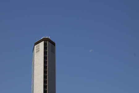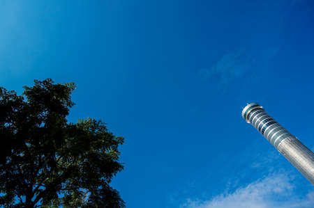 SANTIAGO, CHILE - JANUARY 10, 2018: TV tower against the blue sky. Isolated on blue background. Copy space for text