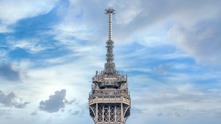 Top of Eiffel Tower in Paris shot against a blue sky. Eiffel Tower, a Parisian landmark, is built for the 1889 World Exposition, it stands as a symbol of France