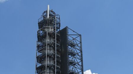 Refinery tower with gray sky in background