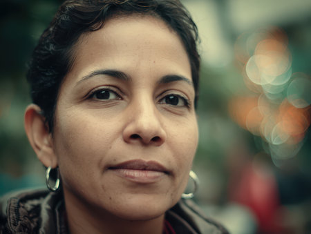 Authentic portrait close-up face latin woman looking away with smile, feeling good and calm.