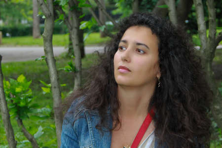 Look of a beautiful young confident girl. Summer park in the background.