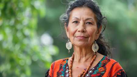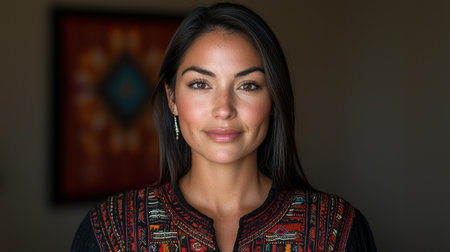 A woman with long dark hair and brown eyes stands in front of a blurred background of green foliage. She is wearing a colorful, traditional blouse with intricate embroidery and a beaded necklace. She is smiling gently, looking directly at the camera.