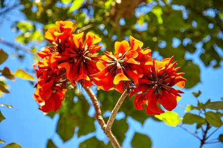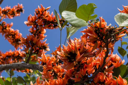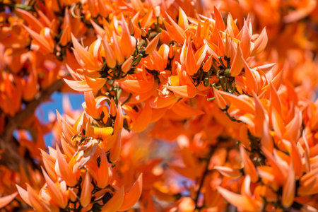 beautiful blooming orange exotic tree flowers closeup Erythrina caffra