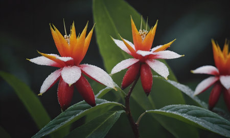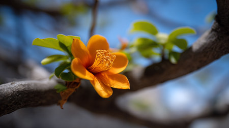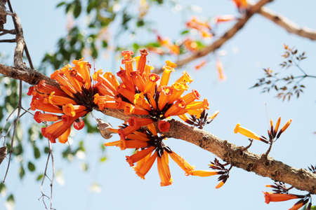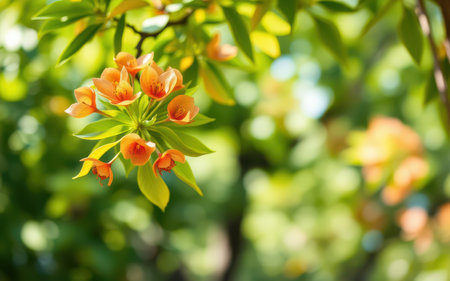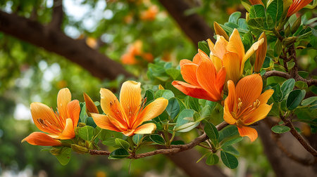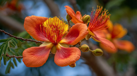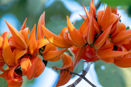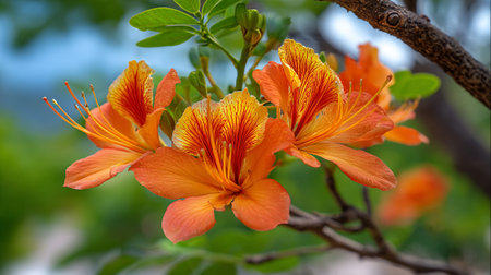 Close-up of Exotic Orange Flowers with Branch and Buds in Natural Setting