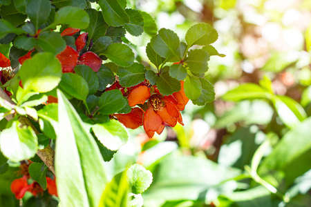 Bright red and pink chinese Chaemnomeles superba quince flowers blossom in spring in the garden with green leaves background.