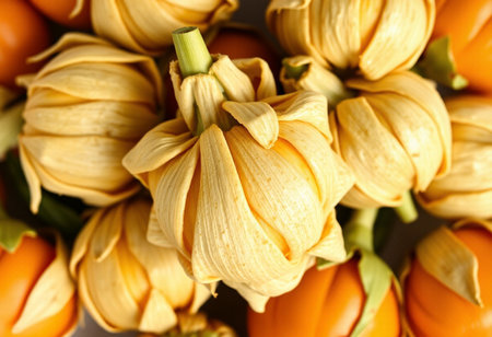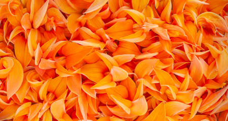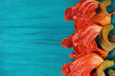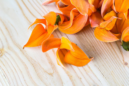 Orange crumpled Asian flowers on brown background. creative floral concept.