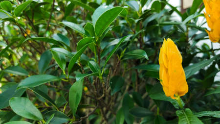 Beautiful gold finger plant Juanulloa mexicana blooming outdoors in Japan. High quality photo
