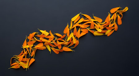 A top-down flat lay of bright orange and yellow marigold petals arranged in the shape of an upward-trending stock market graph or arrow on a dark, textured background. This image symbolizes growth, success, finance, or a positive trend.