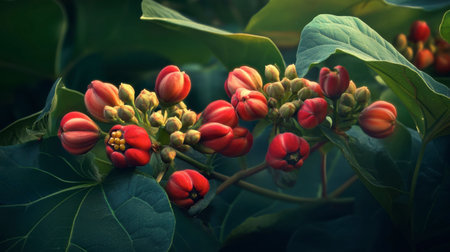 Beautiful closeup of vibrant red flower buds nestled among rich green leaves, showcasing the splendor of nature. Perfect for botanical themes.