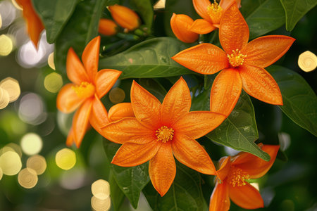 Immerse yourself in the captivating beauty of vibrant orange flowers, delicately adorned with lush green leaves The ethereal bokeh background adds depth and intrigue, showcasing nature's diverse artistry This close-up masterpiece will ignite the passion of floral enthusiasts, inspire gardeners, and delight naturalists alike AI Generative