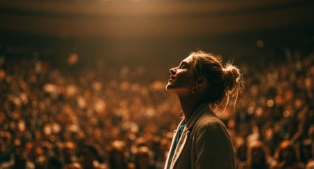 Female audience member looks up in a packed auditorium, surrounded by cheering crowd, illuminated by warm lighting, evoking feelings of excitement and anticipation