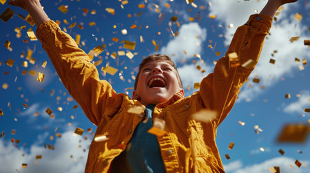 Joyful child celebrating with arms raised, surrounded by golden confetti against bright blue sky. scene captures moment of pure happiness and excitement