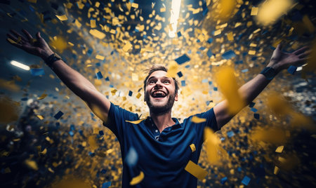 Soccer player celebrating the victory under confetti in crowded stadium, Generative AI