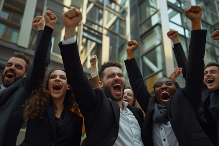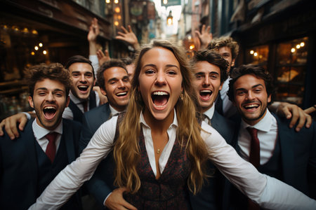 Group of happy business people celebrating success. They are standing on the street.