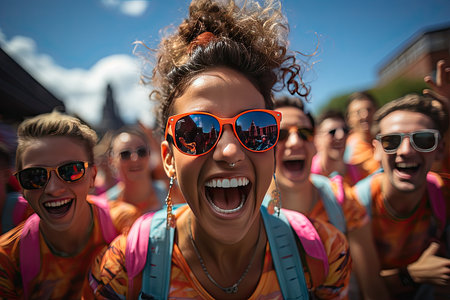 Young adults in red shirts are joyfully celebrating together, showcasing excitement and camaraderie in a vibrant atmosphere filled with energy and enthusiasm, AI generated