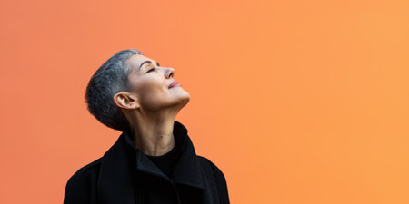 Close up of a confident middle aged woman with a peach copyspace background