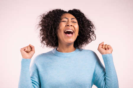 African woman is very glad, she screaming WOW loud. Concept of sales, profitable offer. Excited happy lady on white studio background.