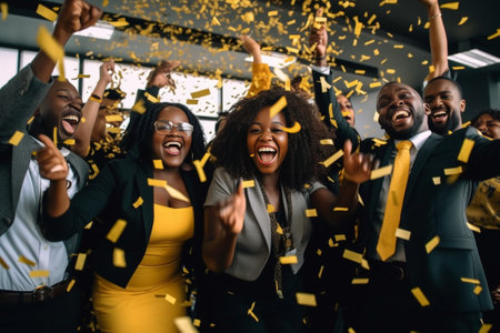 Happy diverse employees team celebrating success business achievement among confetti. AI Generated.