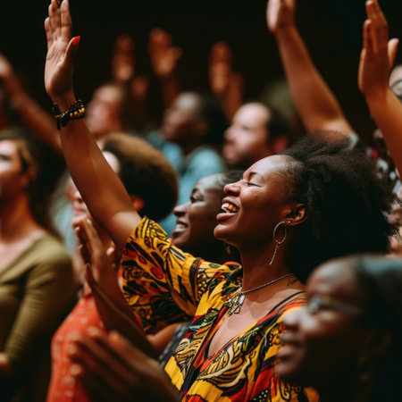 A woman with raised hands expresses joy and spirituality amidst a lively crowd, capturing an inspiring moment of celebration and connection.