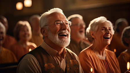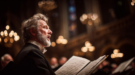 Elderly male singer in formal attire performing in a grand cathedral choir, holding sheet music under warm chandelier lighting.