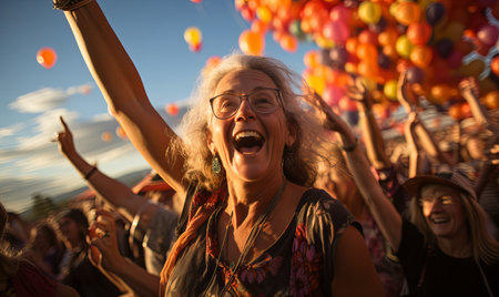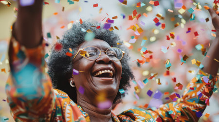 A diverse group of people celebrate an event outdoors. They are smiling and raising their arms as confetti falls around them. The composition features warm colors, suggesting a sunny day. This image may be used for various commercial purposes, including marketing and advertising campaigns.