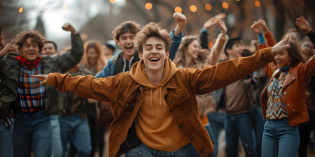 AI captures vibrancy as young adults joyfully dance and bond at a party. Concept Party Photography, Youthful Energy, Dynamic Poses, Happy Moments