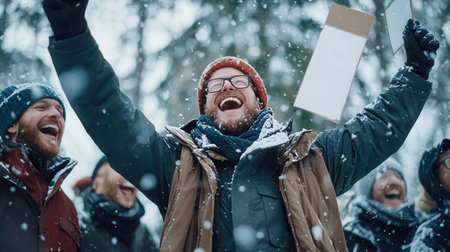 Engineers dressed warmly, celebrating outdoors with snow falling, holding up signs of achievement