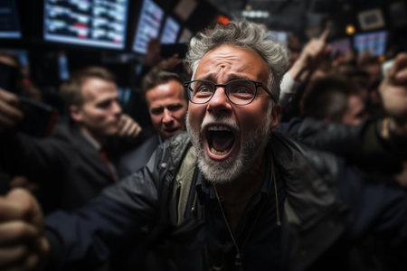 Portrait of a trader on the stock exchange, rejoicing at the rapid growth of shares. Concept of bullish trend in markets. To the moon