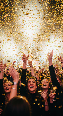A happy crowd of friends toasting with champagne under a shower of golden confetti. This festive image evokes joy and celebration, ideal for New Year's greetings or party promotions.