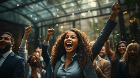 A joyful and diverse group of workers celebrate a common corporate success or win, surrounded by confetti.