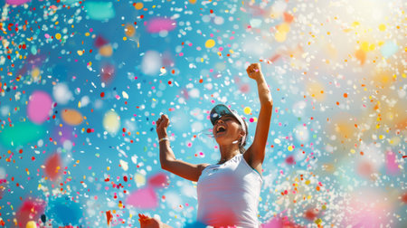a triumphant male athlete is showered in confetti, celebrating his win in the sports competition. With a beaming smile and arms raised in triumph, he embodies the joy and achievement of his sporting success.