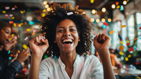 A woman is celebrating with confetti and a smile on her face. The scene is lively and joyful, with the woman surrounded by other people who are also celebrating
