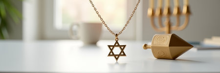 Timeless Jewish Symbols Still Life with Star of David Pendant, Menorah and Dreidel on White Table, Clean Modern Composition with Cultural Meaning and Calm Elegant Atmosphere