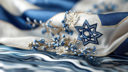 A blue and white cloth with a star of David embroidered on it. The cloth is on a table and the water is in the background