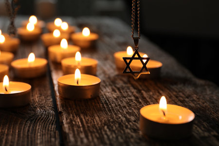 Holocaust Remembrance Day. Pendant in shape of Star of David and burning candles on wooden table, closeup