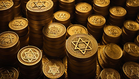A close-up view of stacks of golden coins with the Star of David engraved on them, showing a pattern of wealth and tradition.